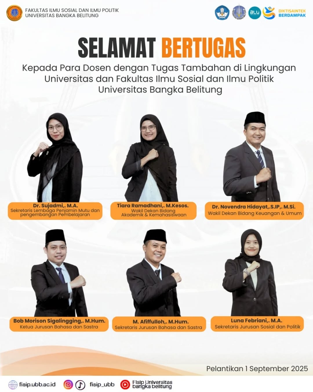 Selamat dan sukses kepada dosen Fisip UBB atas tugas tambahan yang diberikan di lingkungan Universitas dan Fakultas. Semoga semakin menginspirasi, berkontribusi, dan memberi manfaat besar bagi universitas, fakultas, dan masyarakat.